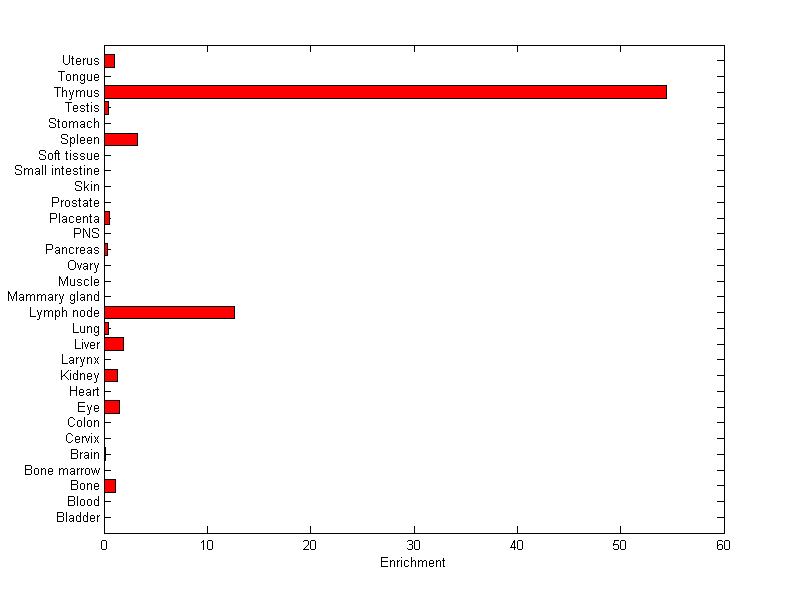 The expression level is normalized with tissue-library size. Each value for a gene in a tissue is a ratio of observed ESTs to the expected one in this tissue. The expected number of ESTs is the product of total ESTs of the gene and the fraction of total ESTs in the tissue among all ESTs in 30 tissues.