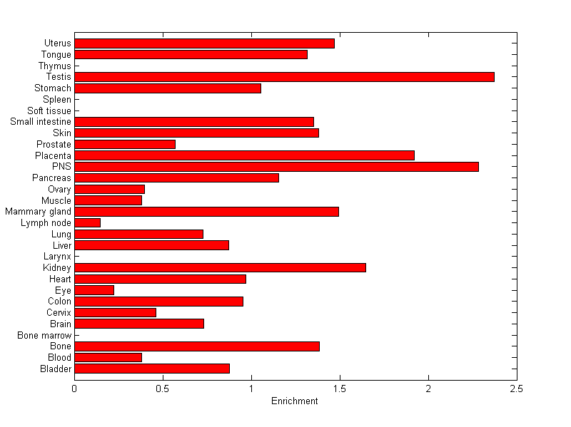 The expression level is normalized with tissue-library size. Each value for a gene in a tissue is a ratio of observed ESTs to the expected one in this tissue. The expected number of ESTs is the product of total ESTs of the gene and the fraction of total ESTs in the tissue among all ESTs in 30 tissues.