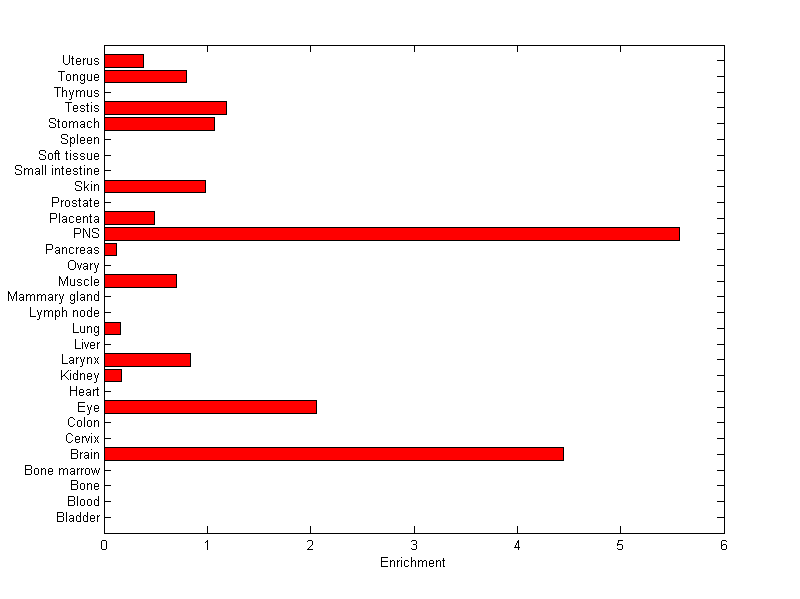 The expression level is normalized with tissue-library size. Each value for a gene in a tissue is a ratio of observed ESTs to the expected one in this tissue. The expected number of ESTs is the product of total ESTs of the gene and the fraction of total ESTs in the tissue among all ESTs in 30 tissues.