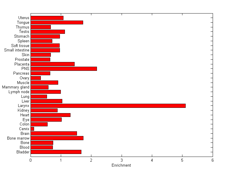 The expression level is normalized with tissue-library size. Each value for a gene in a tissue is a ratio of observed ESTs to the expected one in this tissue. The expected number of ESTs is the product of total ESTs of the gene and the fraction of total ESTs in the tissue among all ESTs in 30 tissues.