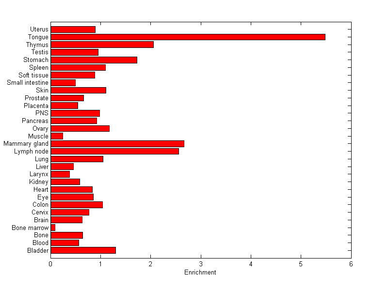 The expression level is normalized with tissue-library size. Each value for a gene in a tissue is a ratio of observed ESTs to the expected one in this tissue. The expected number of ESTs is the product of total ESTs of the gene and the fraction of total ESTs in the tissue among all ESTs in 30 tissues.