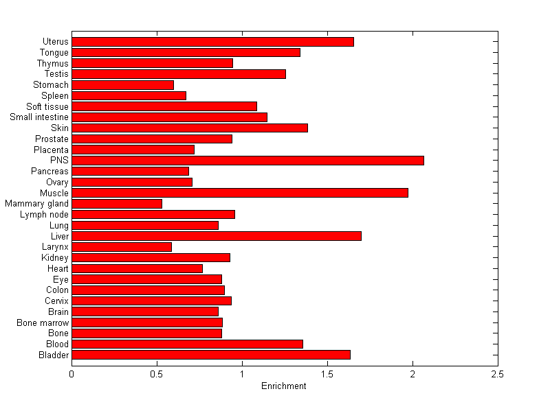 The expression level is normalized with tissue-library size. Each value for a gene in a tissue is a ratio of observed ESTs to the expected one in this tissue. The expected number of ESTs is the product of total ESTs of the gene and the fraction of total ESTs in the tissue among all ESTs in 30 tissues.