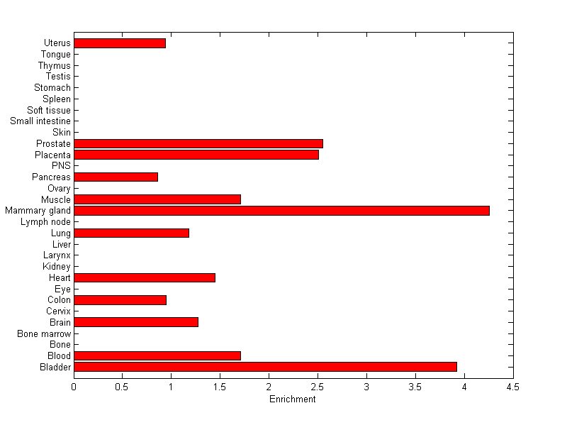 The expression level is normalized with tissue-library size. Each value for a gene in a tissue is a ratio of observed ESTs to the expected one in this tissue. The expected number of ESTs is the product of total ESTs of the gene and the fraction of total ESTs in the tissue among all ESTs in 30 tissues.