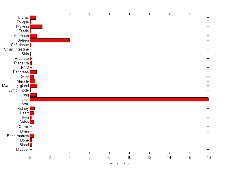 The expression level is normalized with tissue-library size. Each value for a gene in a tissue is a ratio of observed ESTs to the expected one in this tissue. The expected number of ESTs is the product of total ESTs of the gene and the fraction of total ESTs in the tissue among all ESTs in 30 tissues.
