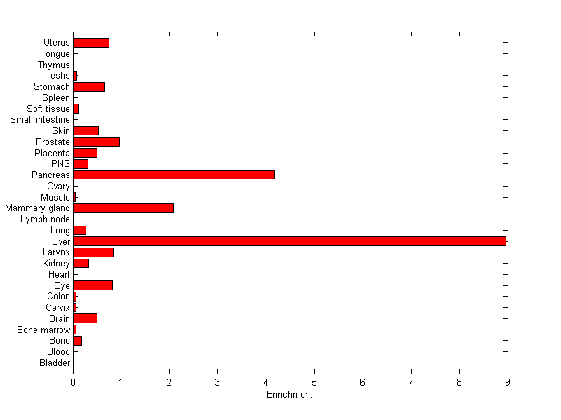 The expression level is normalized with tissue-library size. Each value for a gene in a tissue is a ratio of observed ESTs to the expected one in this tissue. The expected number of ESTs is the product of total ESTs of the gene and the fraction of total ESTs in the tissue among all ESTs in 30 tissues.