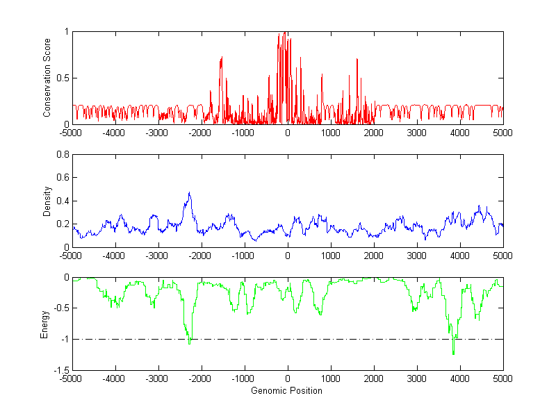 The energy profile (green curve) is about energy for module detection based on TF interaction. The positions with energy less than -1 indicate the existence of CRMs.