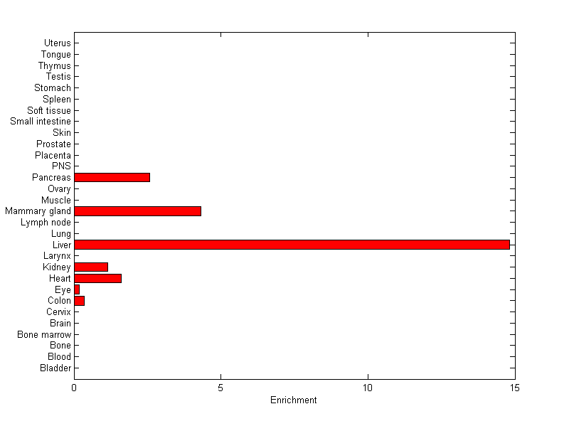 The expression level is normalized with tissue-library size. Each value for a gene in a tissue is a ratio of observed ESTs to the expected one in this tissue. The expected number of ESTs is the product of total ESTs of the gene and the fraction of total ESTs in the tissue among all ESTs in 30 tissues.