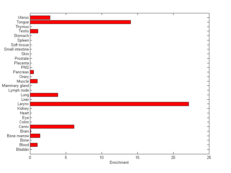 About the profile: The expression level is normalized with tissue-library size. Each value for a gene in a tissue is a ratio of observed ESTs to the expected one in this tissue. The expected number of ESTs is the product of total ESTs of the gene and the fraction of total ESTs in the tissue among all ESTs in 30 tissues. Summary: This gene is preferentially expressed in [larynx, tongue] Download: |