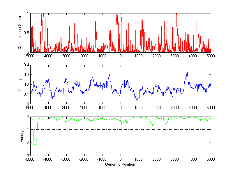 About the profiles: The conservation profile (red curve) is about conservation scores of the promoter sequences. Conservation was determined from an eight-way alignment of human, chimpanzee, dog, mouse, rat, chicken, zebrafish and fugu sequences. The conservation was quantified by a conservation score between 0 and 1, with 1 as highest conservation. The conservation score was obtained from UCSC genome databases. The density profile (blue curve) is about density of all TF binding sites. The energy profile (green curve) is about energy for module detection based on TF interaction. The positions with energy less than -1 indicate the existence of CRMs. Download: Conservation profileDensity profile Energy profile CRM summary |