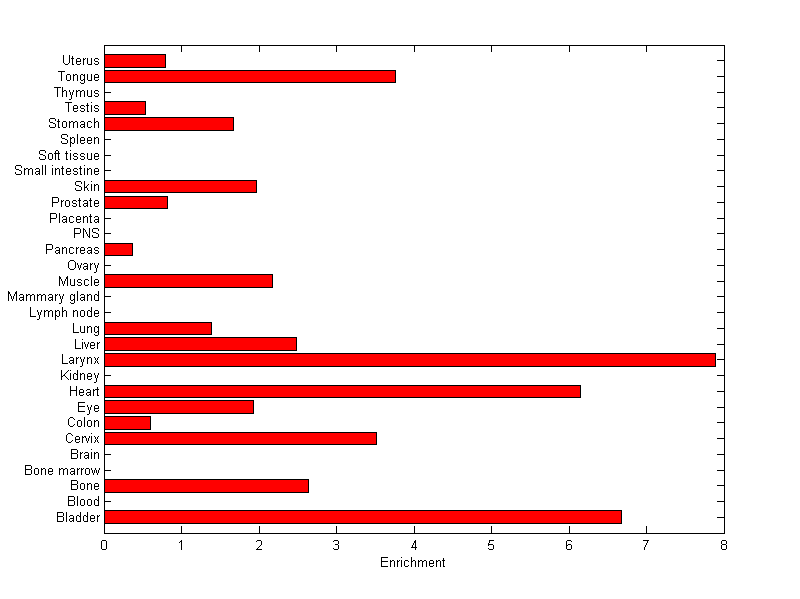 About the profile: The expression level is normalized with tissue-library size. Each value for a gene in a tissue is a ratio of observed ESTs to the expected one in this tissue. The expected number of ESTs is the product of total ESTs of the gene and the fraction of total ESTs in the tissue among all ESTs in 30 tissues. Summary: This gene is preferentially expressed in [heart, larynx] Download: |