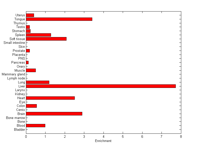 The expression level is normalized with tissue-library size. Each value for a gene in a tissue is a ratio of observed ESTs to the expected one in this tissue. The expected number of ESTs is the product of total ESTs of the gene and the fraction of total ESTs in the tissue among all ESTs in 30 tissues.