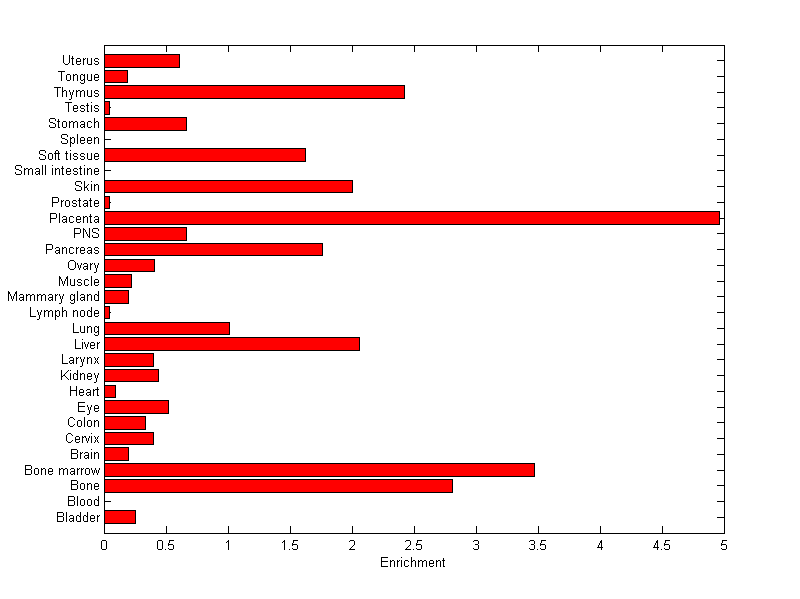 The expression level is normalized with tissue-library size. Each value for a gene in a tissue is a ratio of observed ESTs to the expected one in this tissue. The expected number of ESTs is the product of total ESTs of the gene and the fraction of total ESTs in the tissue among all ESTs in 30 tissues.