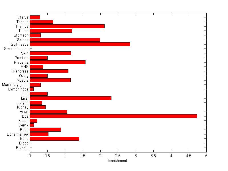 The expression level is normalized with tissue-library size. Each value for a gene in a tissue is a ratio of observed ESTs to the expected one in this tissue. The expected number of ESTs is the product of total ESTs of the gene and the fraction of total ESTs in the tissue among all ESTs in 30 tissues.