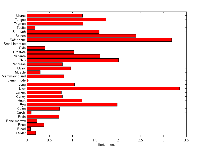 The expression level is normalized with tissue-library size. Each value for a gene in a tissue is a ratio of observed ESTs to the expected one in this tissue. The expected number of ESTs is the product of total ESTs of the gene and the fraction of total ESTs in the tissue among all ESTs in 30 tissues.