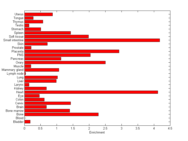 The expression level is normalized with tissue-library size. Each value for a gene in a tissue is a ratio of observed ESTs to the expected one in this tissue. The expected number of ESTs is the product of total ESTs of the gene and the fraction of total ESTs in the tissue among all ESTs in 30 tissues.