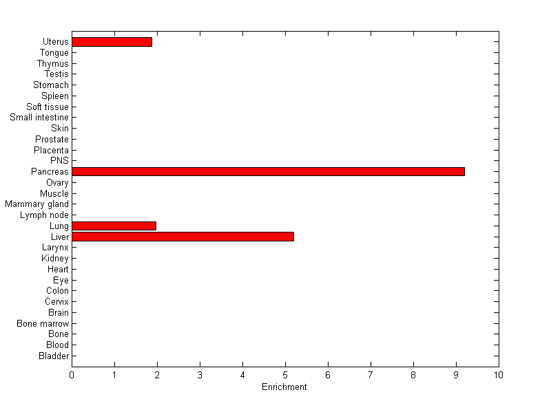 About the profile: The expression level is normalized with tissue-library size. Each value for a gene in a tissue is a ratio of observed ESTs to the expected one in this tissue. The expected number of ESTs is the product of total ESTs of the gene and the fraction of total ESTs in the tissue among all ESTs in 30 tissues. Summary: This gene is preferentially expressed in [pancreas] Download: |
