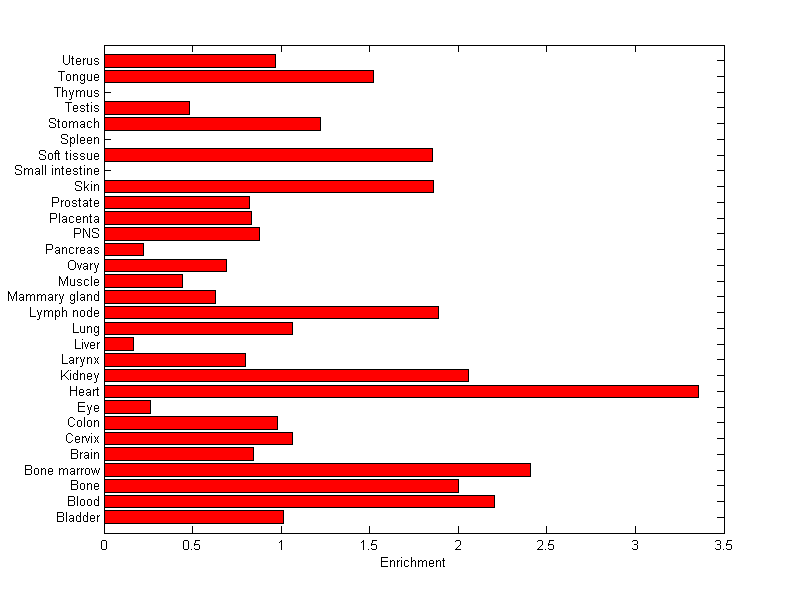 The expression level is normalized with tissue-library size. Each value for a gene in a tissue is a ratio of observed ESTs to the expected one in this tissue. The expected number of ESTs is the product of total ESTs of the gene and the fraction of total ESTs in the tissue among all ESTs in 30 tissues.
