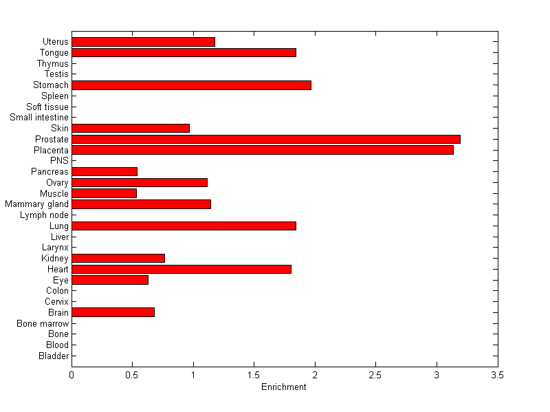 The expression level is normalized with tissue-library size. Each value for a gene in a tissue is a ratio of observed ESTs to the expected one in this tissue. The expected number of ESTs is the product of total ESTs of the gene and the fraction of total ESTs in the tissue among all ESTs in 30 tissues.