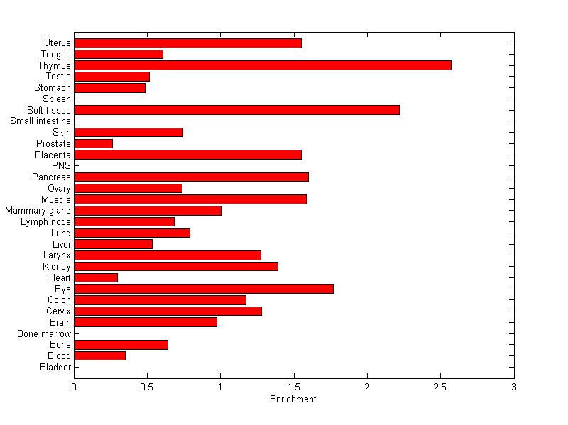 The expression level is normalized with tissue-library size. Each value for a gene in a tissue is a ratio of observed ESTs to the expected one in this tissue. The expected number of ESTs is the product of total ESTs of the gene and the fraction of total ESTs in the tissue among all ESTs in 30 tissues.