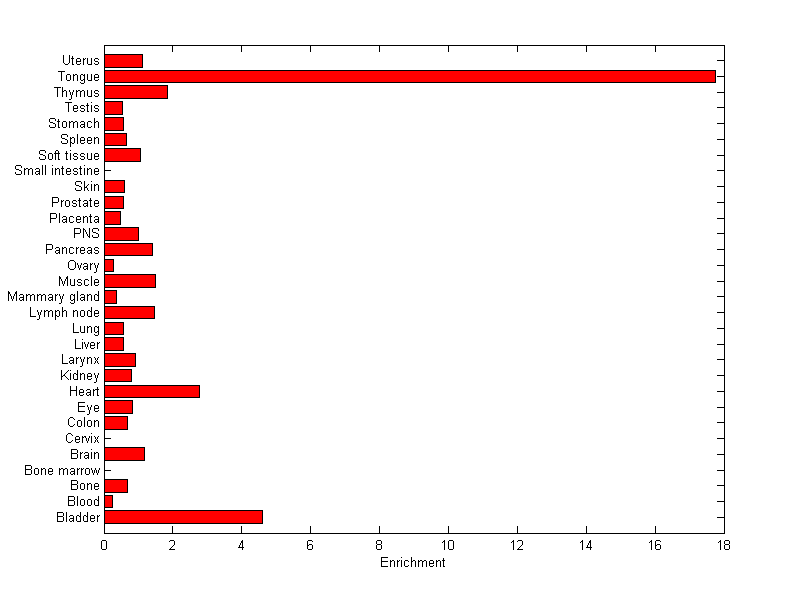 About the profile: The expression level is normalized with tissue-library size. Each value for a gene in a tissue is a ratio of observed ESTs to the expected one in this tissue. The expected number of ESTs is the product of total ESTs of the gene and the fraction of total ESTs in the tissue among all ESTs in 30 tissues. Summary: This gene is preferentially expressed in [tongue] Download: |