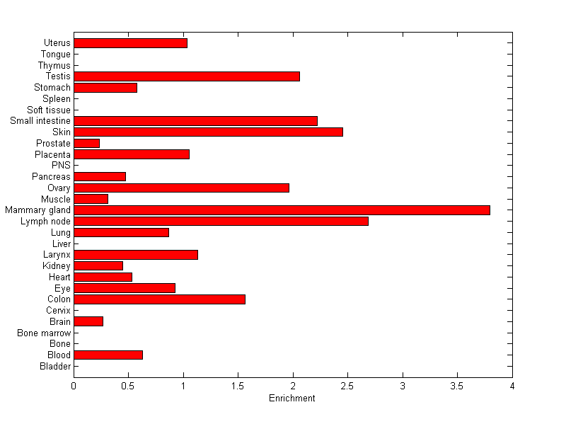 The expression level is normalized with tissue-library size. Each value for a gene in a tissue is a ratio of observed ESTs to the expected one in this tissue. The expected number of ESTs is the product of total ESTs of the gene and the fraction of total ESTs in the tissue among all ESTs in 30 tissues.