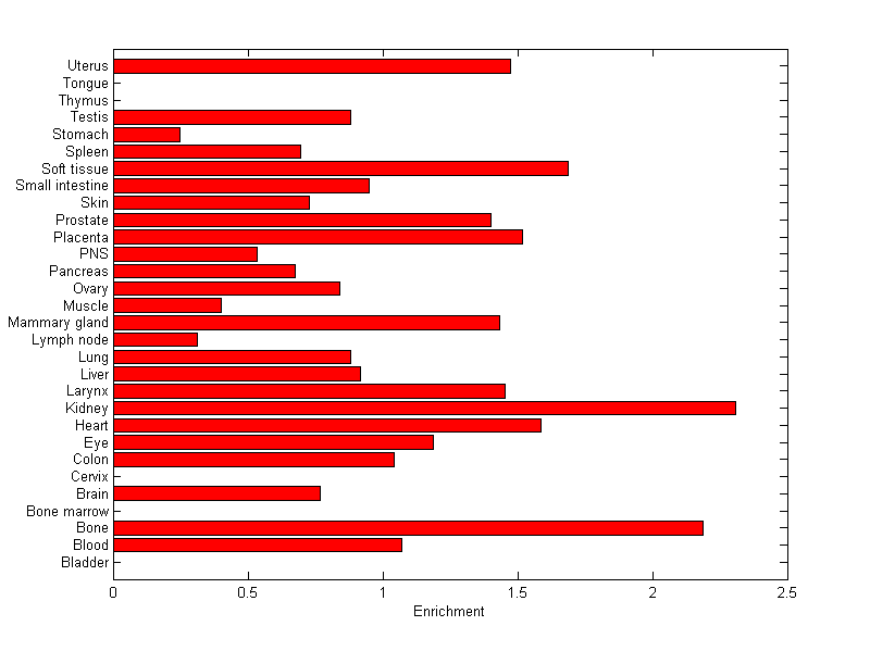 The expression level is normalized with tissue-library size. Each value for a gene in a tissue is a ratio of observed ESTs to the expected one in this tissue. The expected number of ESTs is the product of total ESTs of the gene and the fraction of total ESTs in the tissue among all ESTs in 30 tissues.