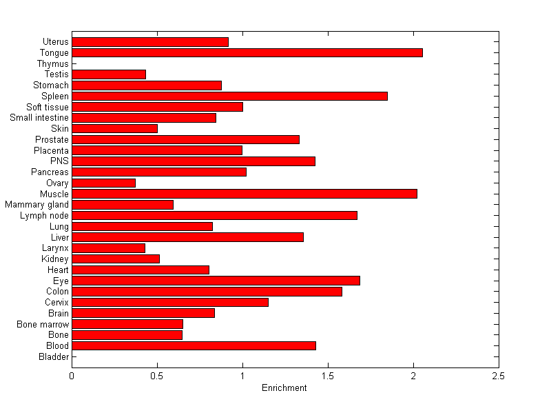 The expression level is normalized with tissue-library size. Each value for a gene in a tissue is a ratio of observed ESTs to the expected one in this tissue. The expected number of ESTs is the product of total ESTs of the gene and the fraction of total ESTs in the tissue among all ESTs in 30 tissues.