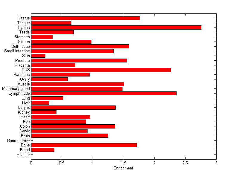 The expression level is normalized with tissue-library size. Each value for a gene in a tissue is a ratio of observed ESTs to the expected one in this tissue. The expected number of ESTs is the product of total ESTs of the gene and the fraction of total ESTs in the tissue among all ESTs in 30 tissues.