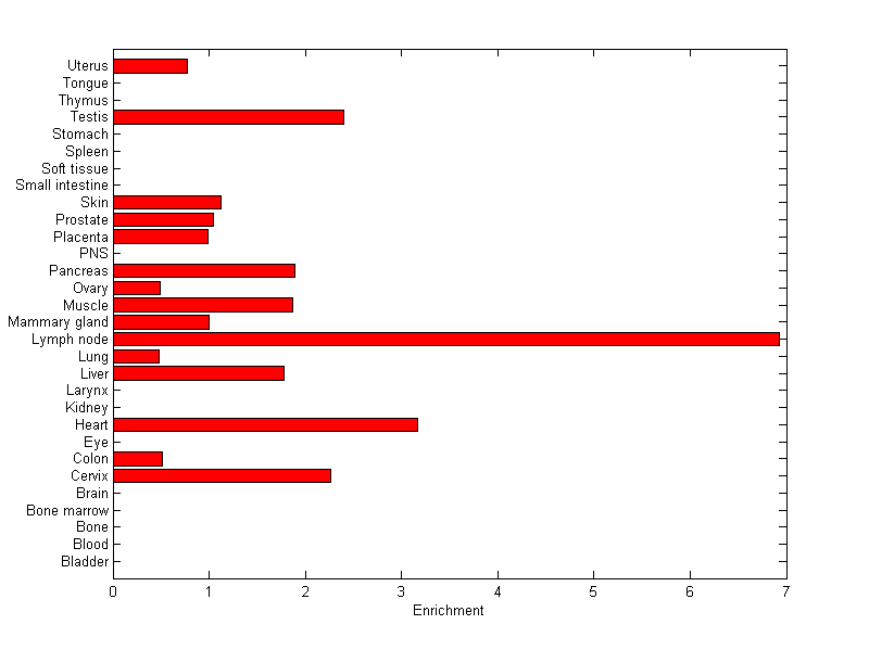 The expression level is normalized with tissue-library size. Each value for a gene in a tissue is a ratio of observed ESTs to the expected one in this tissue. The expected number of ESTs is the product of total ESTs of the gene and the fraction of total ESTs in the tissue among all ESTs in 30 tissues.