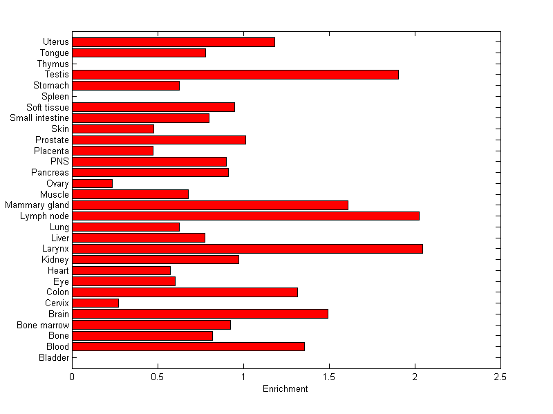 The expression level is normalized with tissue-library size. Each value for a gene in a tissue is a ratio of observed ESTs to the expected one in this tissue. The expected number of ESTs is the product of total ESTs of the gene and the fraction of total ESTs in the tissue among all ESTs in 30 tissues.