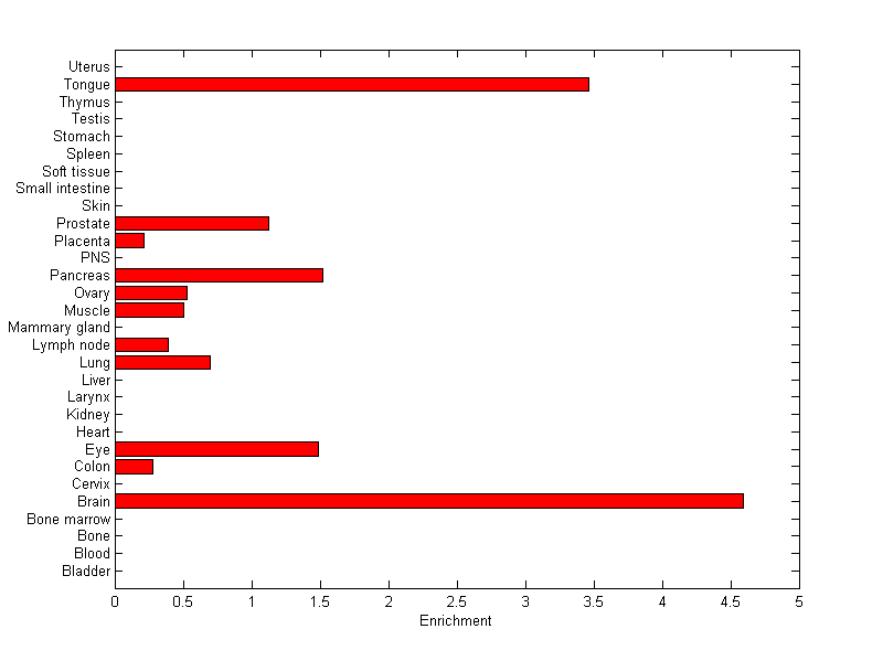 The expression level is normalized with tissue-library size. Each value for a gene in a tissue is a ratio of observed ESTs to the expected one in this tissue. The expected number of ESTs is the product of total ESTs of the gene and the fraction of total ESTs in the tissue among all ESTs in 30 tissues.