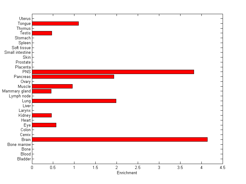 The expression level is normalized with tissue-library size. Each value for a gene in a tissue is a ratio of observed ESTs to the expected one in this tissue. The expected number of ESTs is the product of total ESTs of the gene and the fraction of total ESTs in the tissue among all ESTs in 30 tissues.