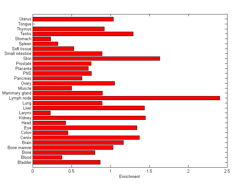 The expression level is normalized with tissue-library size. Each value for a gene in a tissue is a ratio of observed ESTs to the expected one in this tissue. The expected number of ESTs is the product of total ESTs of the gene and the fraction of total ESTs in the tissue among all ESTs in 30 tissues.