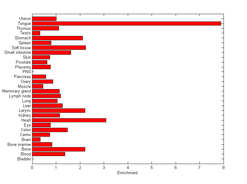 About the profile: The expression level is normalized with tissue-library size. Each value for a gene in a tissue is a ratio of observed ESTs to the expected one in this tissue. The expected number of ESTs is the product of total ESTs of the gene and the fraction of total ESTs in the tissue among all ESTs in 30 tissues. Summary: This gene is preferentially expressed in [tongue] Download: |