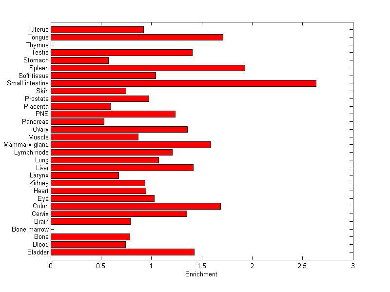 The expression level is normalized with tissue-library size. Each value for a gene in a tissue is a ratio of observed ESTs to the expected one in this tissue. The expected number of ESTs is the product of total ESTs of the gene and the fraction of total ESTs in the tissue among all ESTs in 30 tissues.