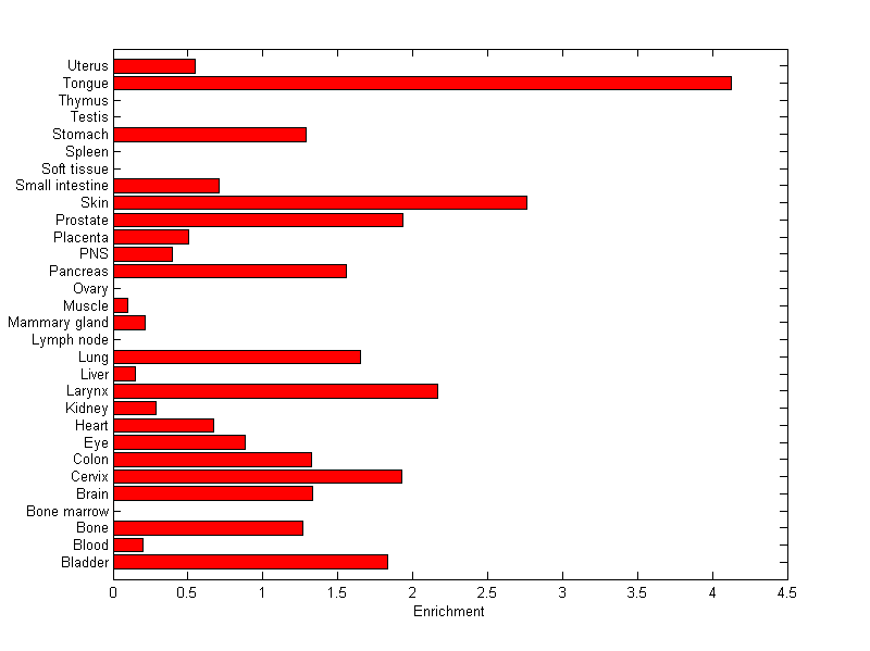 The expression level is normalized with tissue-library size. Each value for a gene in a tissue is a ratio of observed ESTs to the expected one in this tissue. The expected number of ESTs is the product of total ESTs of the gene and the fraction of total ESTs in the tissue among all ESTs in 30 tissues.