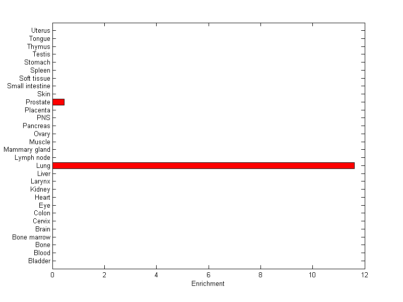 About the profile: The expression level is normalized with tissue-library size. Each value for a gene in a tissue is a ratio of observed ESTs to the expected one in this tissue. The expected number of ESTs is the product of total ESTs of the gene and the fraction of total ESTs in the tissue among all ESTs in 30 tissues. Summary: This gene is preferentially expressed in [lung] Download: |