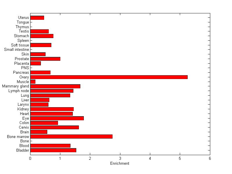 The expression level is normalized with tissue-library size. Each value for a gene in a tissue is a ratio of observed ESTs to the expected one in this tissue. The expected number of ESTs is the product of total ESTs of the gene and the fraction of total ESTs in the tissue among all ESTs in 30 tissues.