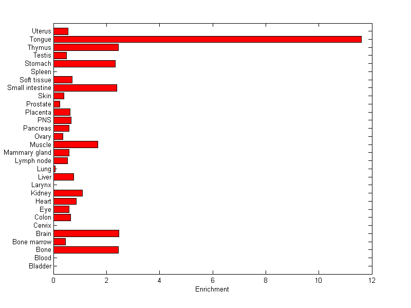 The expression level is normalized with tissue-library size. Each value for a gene in a tissue is a ratio of observed ESTs to the expected one in this tissue. The expected number of ESTs is the product of total ESTs of the gene and the fraction of total ESTs in the tissue among all ESTs in 30 tissues.