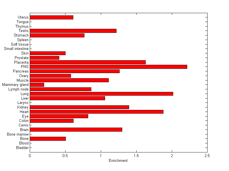 The expression level is normalized with tissue-library size. Each value for a gene in a tissue is a ratio of observed ESTs to the expected one in this tissue. The expected number of ESTs is the product of total ESTs of the gene and the fraction of total ESTs in the tissue among all ESTs in 30 tissues.