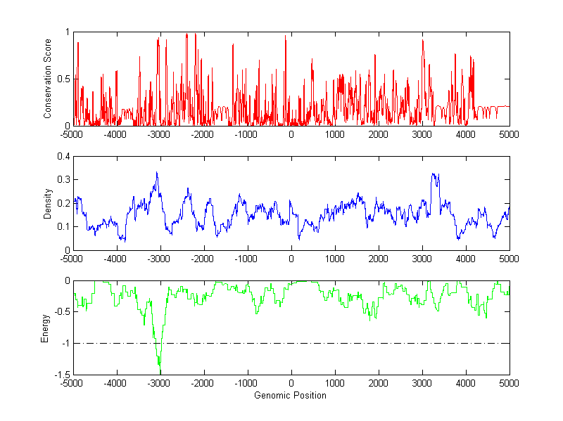 The energy profile (green curve) is about energy for module detection based on TF interaction. The positions with energy less than -1 indicate the existence of CRMs.