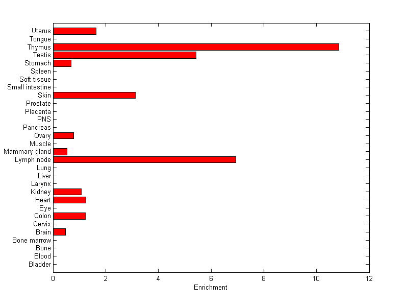 The expression level is normalized with tissue-library size. Each value for a gene in a tissue is a ratio of observed ESTs to the expected one in this tissue. The expected number of ESTs is the product of total ESTs of the gene and the fraction of total ESTs in the tissue among all ESTs in 30 tissues.