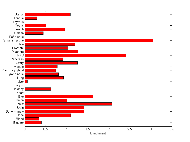 The expression level is normalized with tissue-library size. Each value for a gene in a tissue is a ratio of observed ESTs to the expected one in this tissue. The expected number of ESTs is the product of total ESTs of the gene and the fraction of total ESTs in the tissue among all ESTs in 30 tissues.