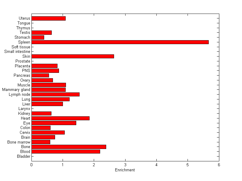 The expression level is normalized with tissue-library size. Each value for a gene in a tissue is a ratio of observed ESTs to the expected one in this tissue. The expected number of ESTs is the product of total ESTs of the gene and the fraction of total ESTs in the tissue among all ESTs in 30 tissues.