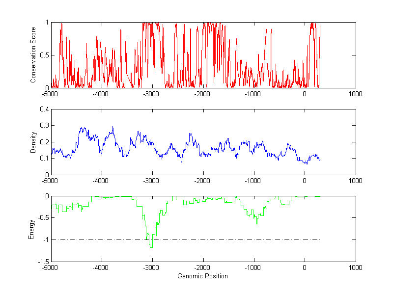 About the profiles: The conservation profile (red curve) is about conservation scores of the promoter sequences. Conservation was determined from an eight-way alignment of human, chimpanzee, dog, mouse, rat, chicken, zebrafish and fugu sequences. The conservation was quantified by a conservation score between 0 and 1, with 1 as highest conservation. The conservation score was obtained from UCSC genome databases. The density profile (blue curve) is about density of all TF binding sites. The energy profile (green curve) is about energy for module detection based on TF interaction. The positions with energy less than -1 indicate the existence of CRMs. Download: Conservation profileDensity profile Energy profile CRM summary |