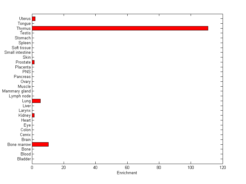About the profile: The expression level is normalized with tissue-library size. Each value for a gene in a tissue is a ratio of observed ESTs to the expected one in this tissue. The expected number of ESTs is the product of total ESTs of the gene and the fraction of total ESTs in the tissue among all ESTs in 30 tissues. Summary: This gene is preferentially expressed in [lung, thymus] Download: |