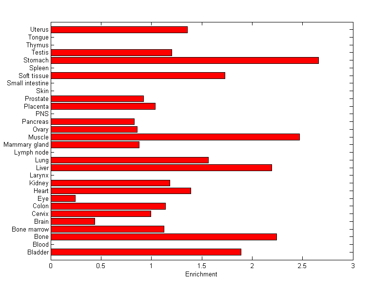 The expression level is normalized with tissue-library size. Each value for a gene in a tissue is a ratio of observed ESTs to the expected one in this tissue. The expected number of ESTs is the product of total ESTs of the gene and the fraction of total ESTs in the tissue among all ESTs in 30 tissues.