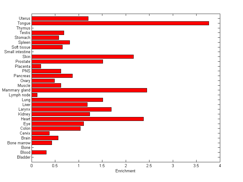 The expression level is normalized with tissue-library size. Each value for a gene in a tissue is a ratio of observed ESTs to the expected one in this tissue. The expected number of ESTs is the product of total ESTs of the gene and the fraction of total ESTs in the tissue among all ESTs in 30 tissues.