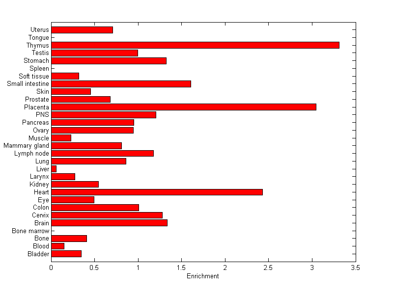 The expression level is normalized with tissue-library size. Each value for a gene in a tissue is a ratio of observed ESTs to the expected one in this tissue. The expected number of ESTs is the product of total ESTs of the gene and the fraction of total ESTs in the tissue among all ESTs in 30 tissues.