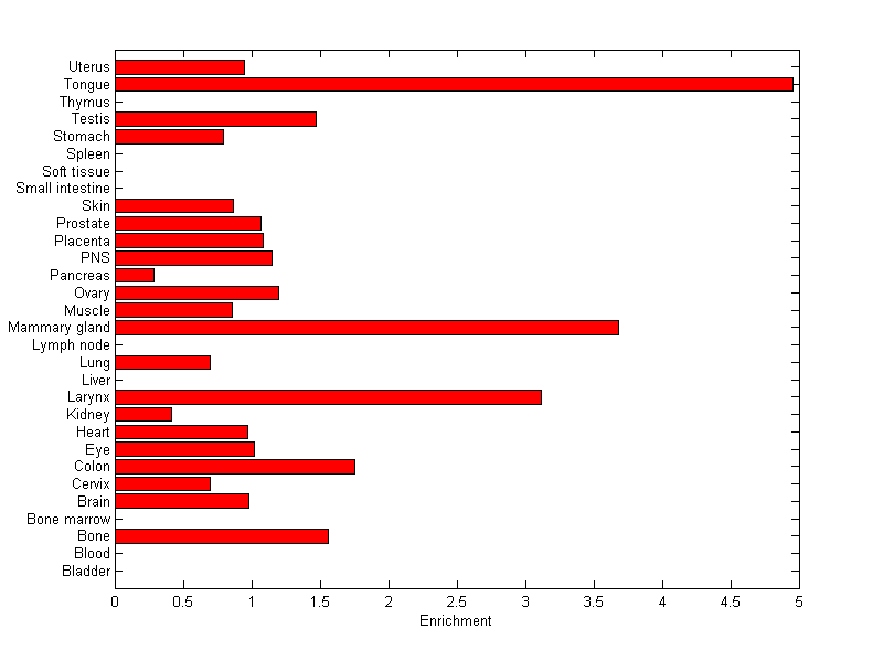 The expression level is normalized with tissue-library size. Each value for a gene in a tissue is a ratio of observed ESTs to the expected one in this tissue. The expected number of ESTs is the product of total ESTs of the gene and the fraction of total ESTs in the tissue among all ESTs in 30 tissues.
